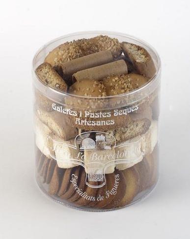 Los botes de surtido variado de 1 quilo, son la perfecta mezcla de nuestras mejores galletas artesanas de pasta seca. Una base de teulas, carquinyolis, cubanos grandes, cubanos de chocolate, largas de almendra, una tira de apinyonats de coco y pastas de te, presentadas en estos botes listos para servir en la mesa. También pueden servir como obsequio.